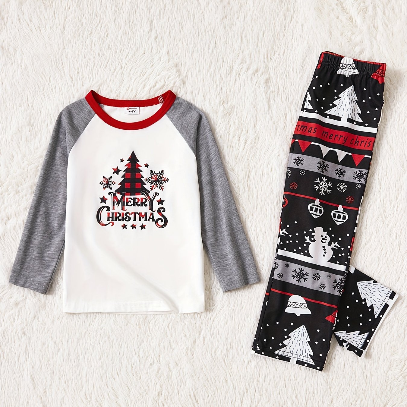 Familien Graues Weihnachtspyjama Set - Raglanärmel und Festlicher Baumdruck